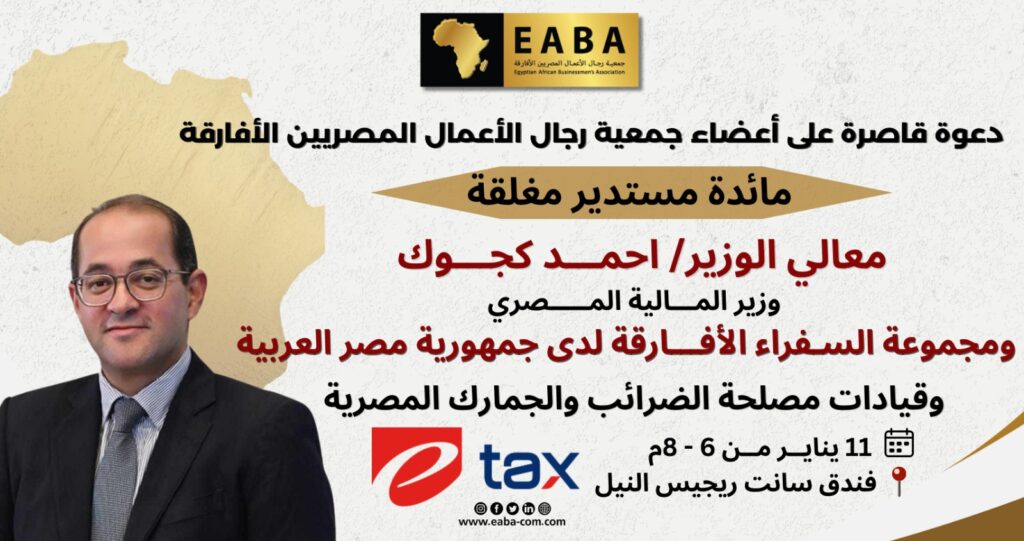 تهديكم جمعية رجال الأعمال المصريين الأفارقة خالص تحياتها وحرصًا على تعظيم الاستفادة لأعضائها من التجارب الوطنية الرائدة، يسعد جمعية رجال الأعمال المصريين الأفارقة، بالتعاون مع شركة E-TAX، أن تتشرف بدعوتكم لحضور مائدة مستديرة مغلقة ، بمشاركة وحضور معالي وزير المالية المصري، السيد/ أحمد كجوك والسادة السفراء الأفارقة ، تحت عنوان: التجربة المصرية في الإصلاحات المالية من أجل التنمية – توظيف التكنولوجيا الرقمية