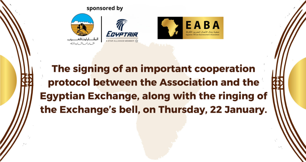 Continuing the ongoing efforts and distinguished relationships that link the Egyptian-African Business Association (EABA) with its strategic partners, and keen to enhance collaboration with external entities, we are pleased to invite you to participate in the signing of a joint cooperation protocol with the Egyptian Exchange.